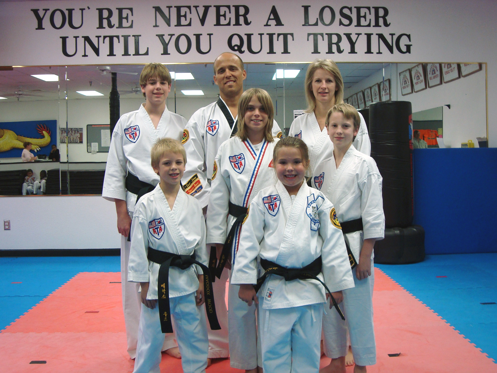 Congratulations to the newest ATA Black Belts in our school. Listed by appearance in photo (back row, left to right) Mitchell Wood, Mrs. Wendy Wood, (middle row, left to right) Drew Harrelson, Mason Wood, (front row, left to right) Maddux Wood, and Courtney Harrelson.